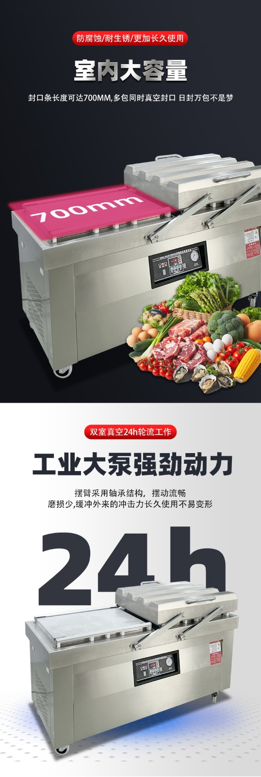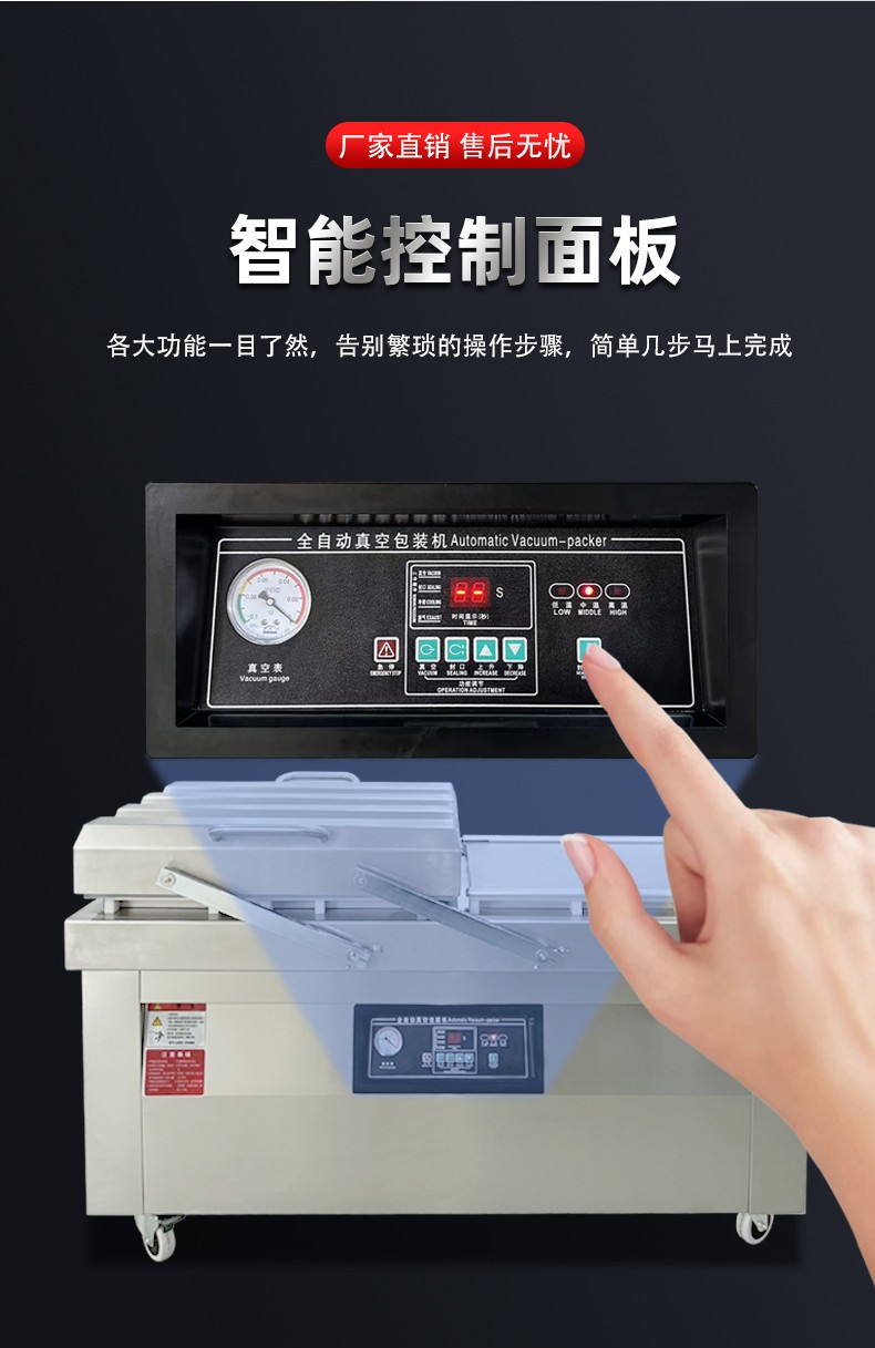 雙室平板真空包裝機(jī)對比單室真空包裝機(jī),核心優(yōu)勢集中在作業(yè)效率、生產(chǎn)連續(xù)性、人工利用率:
