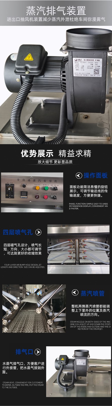 - 操作維護簡便:設計精巧,外型美觀,不占空間,移動、安裝迅速快捷。部分蒸汽收縮機可掀蓋查看機器內部的情況,清潔保養起來更方便4。